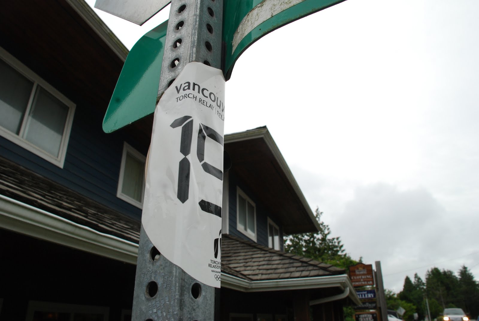 Fast forward to last week. I am driving into Tofino, the sun is shining ( for the first time as I visit) and lo and behold, on the first Stop Sign going into town is a faded Torch Relay Marker, that bears the number 153, Keri’s Olympic Torch Relay marker still there, the memories flooded back.